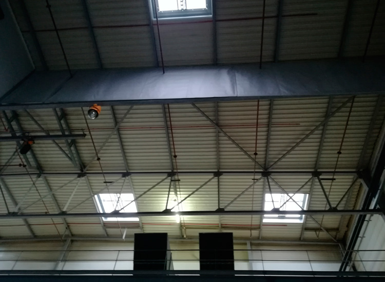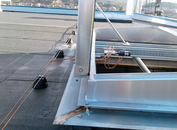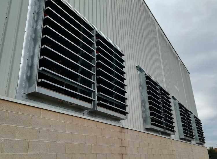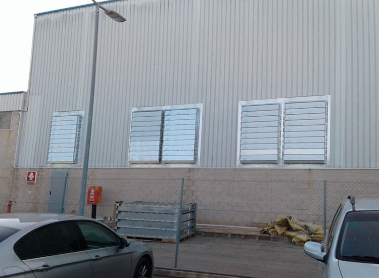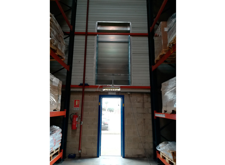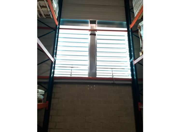 Los trabajos han consistido en la instalación de exutorios de tipo claraboya para favorecer la iluminación natural del almacén industrial, exutorios de pared para aporte de admisión de aire y conexión de todos los equipos con un cuadro de maniobra a través de red de tubo de cobre.